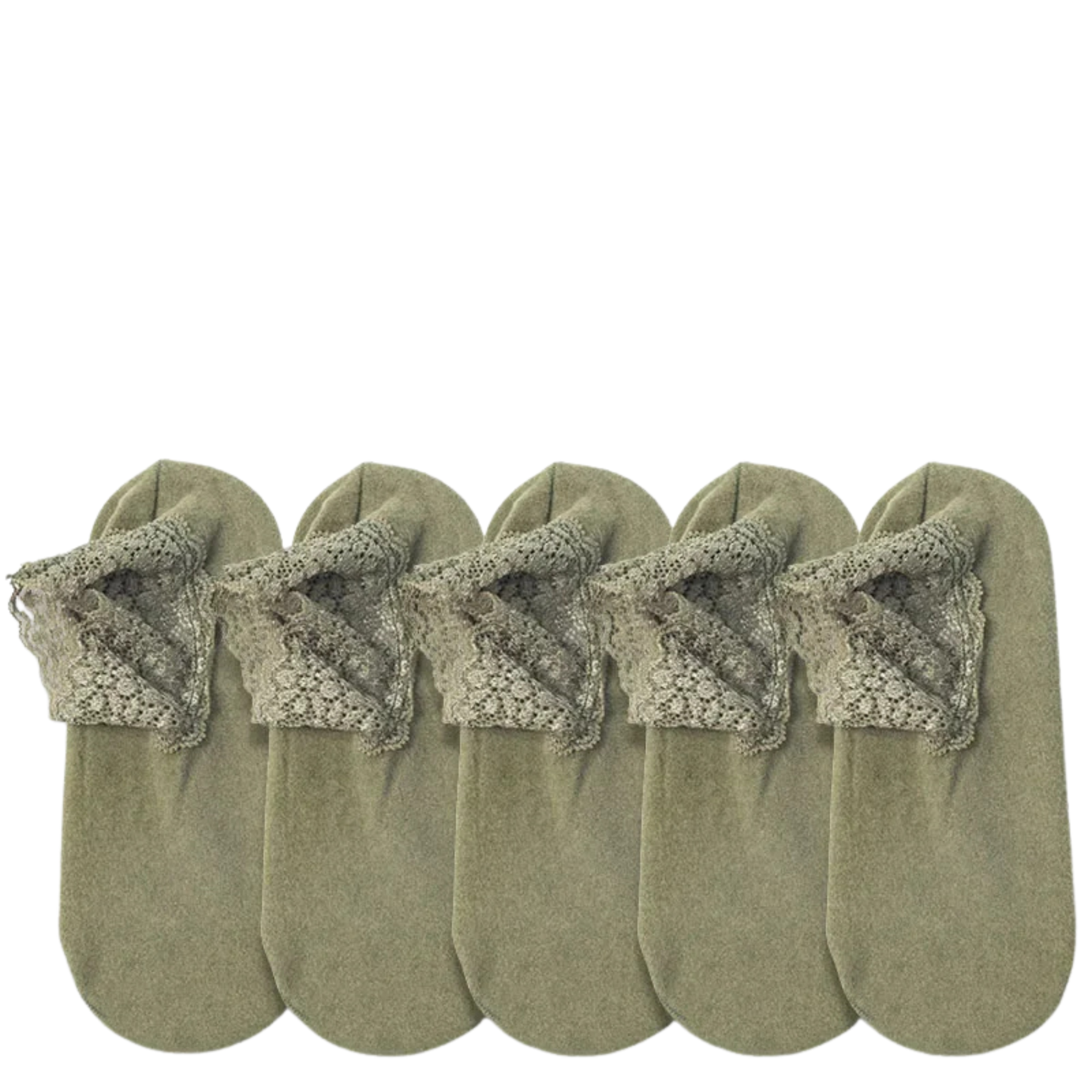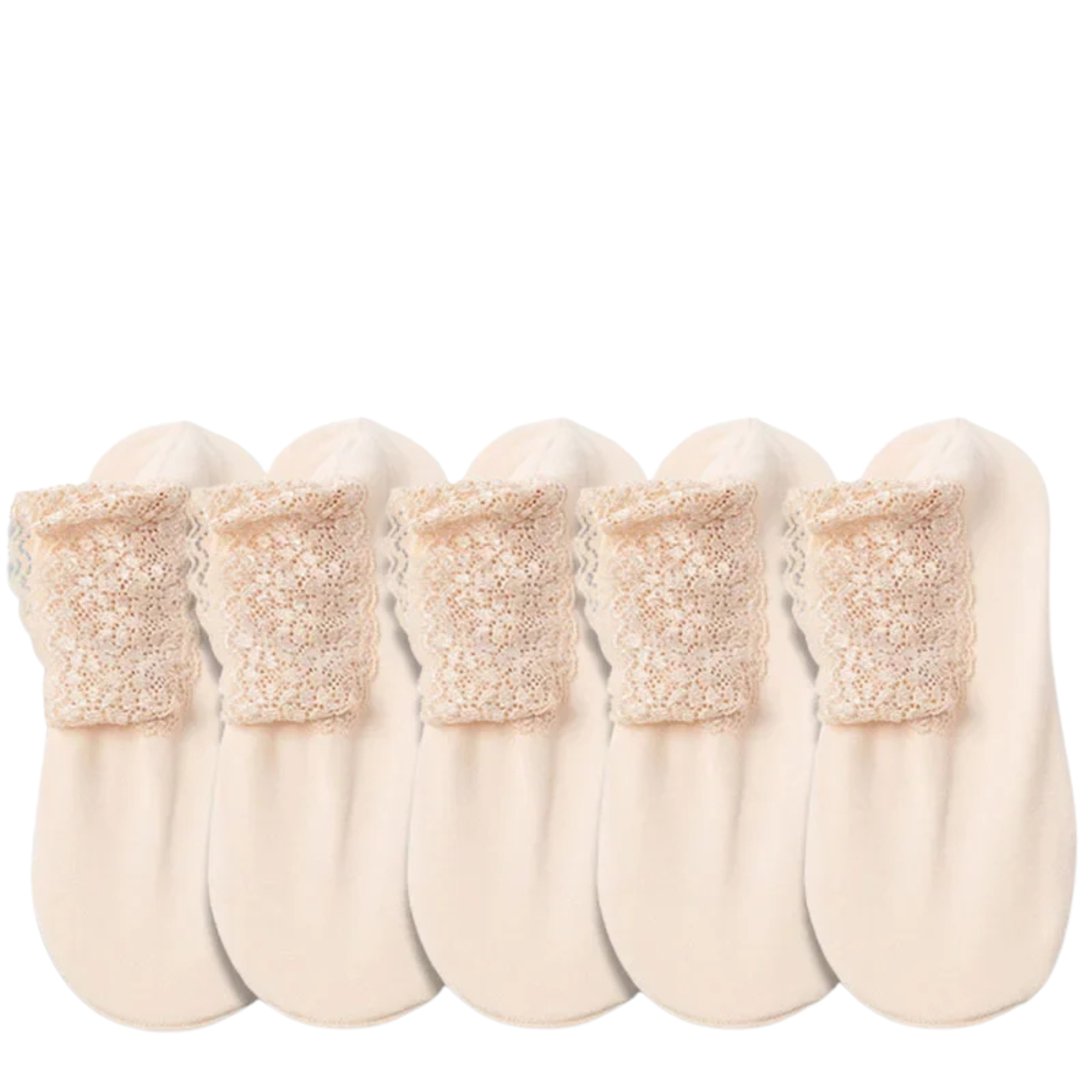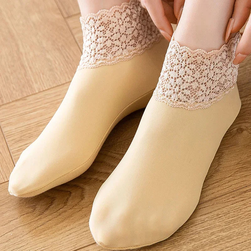 Made from premium German velvet, these lace-trimmed socks deliver featherlight warmth with a buttery-soft touch. The scalloped lace cuff adds a feminine edge, while the low-cut stretch design stays put—finished with discreet non-slip grips for all-day indoor confidence.