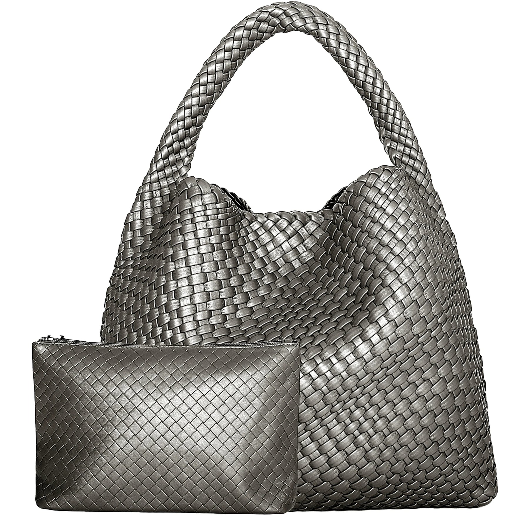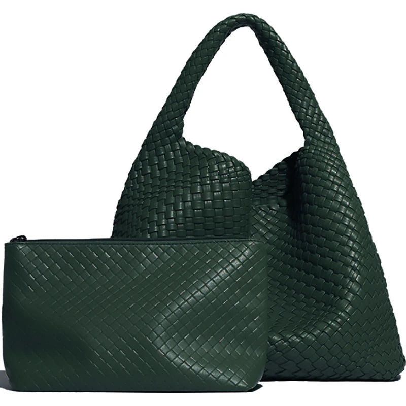 Crafted from supple vegan leather in a luxe basketweave, this hand-woven shoulder bag blends relaxed structure with a naturally draped silhouette that holds its shape. The spacious interior features a hidden magnetic closure, removable base insert, and a detachable zip pouch for secure, organized carry. Designed for modern everyday use—where form meets function with effortless style.